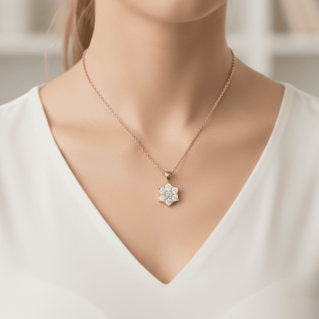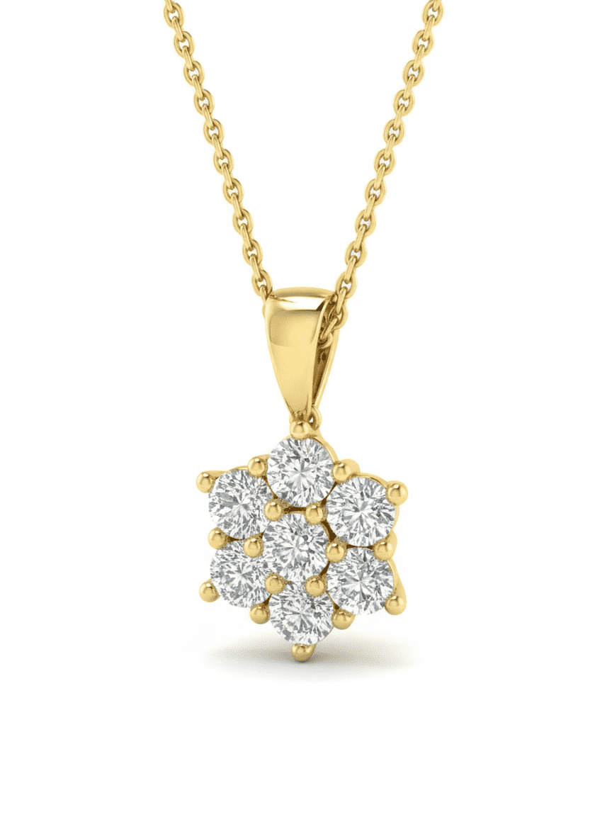 A refined flower cluster pendant crafted in 9K gold, set with lab-grown diamonds totalling 1.01ct. The diamonds are F colour and VS clarity, offering a soft, elegant brilliance. Prong set for a classic finish and paired with a fine chain, this pendant is designed for effortless, everyday elegance.