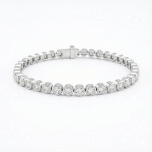 Striking and elegant, this bracelet is crafted in 9K white gold and set with lab-grown diamonds totaling 2.98 carats. Featuring F color and VS clarity, the diamonds deliver exceptional brilliance, while the solid 7.5g gold weight offers a luxurious feel. Designed in a classic 7.1-inch length, this bracelet is perfect for making a bold yet timeless statement.