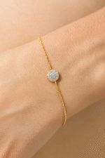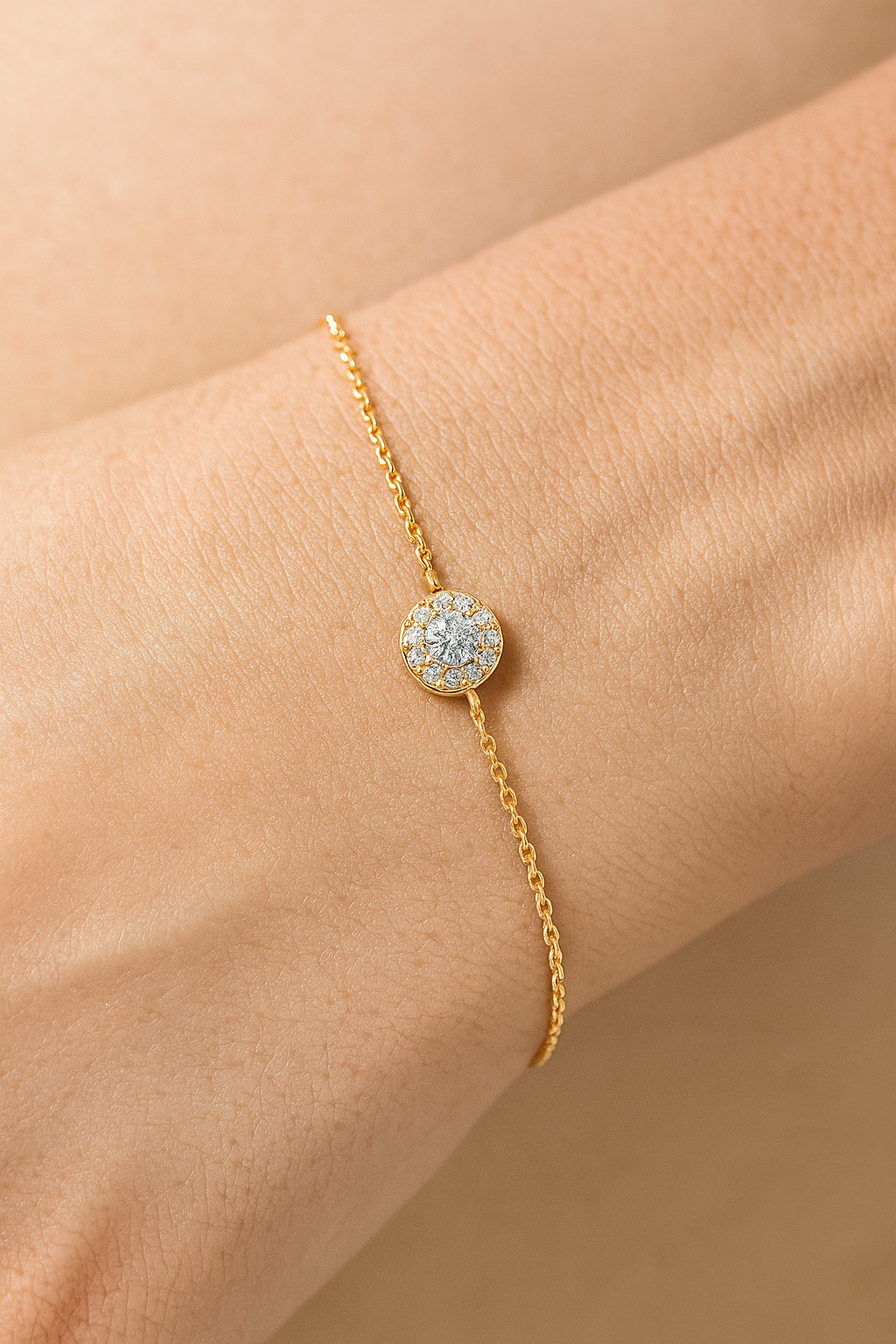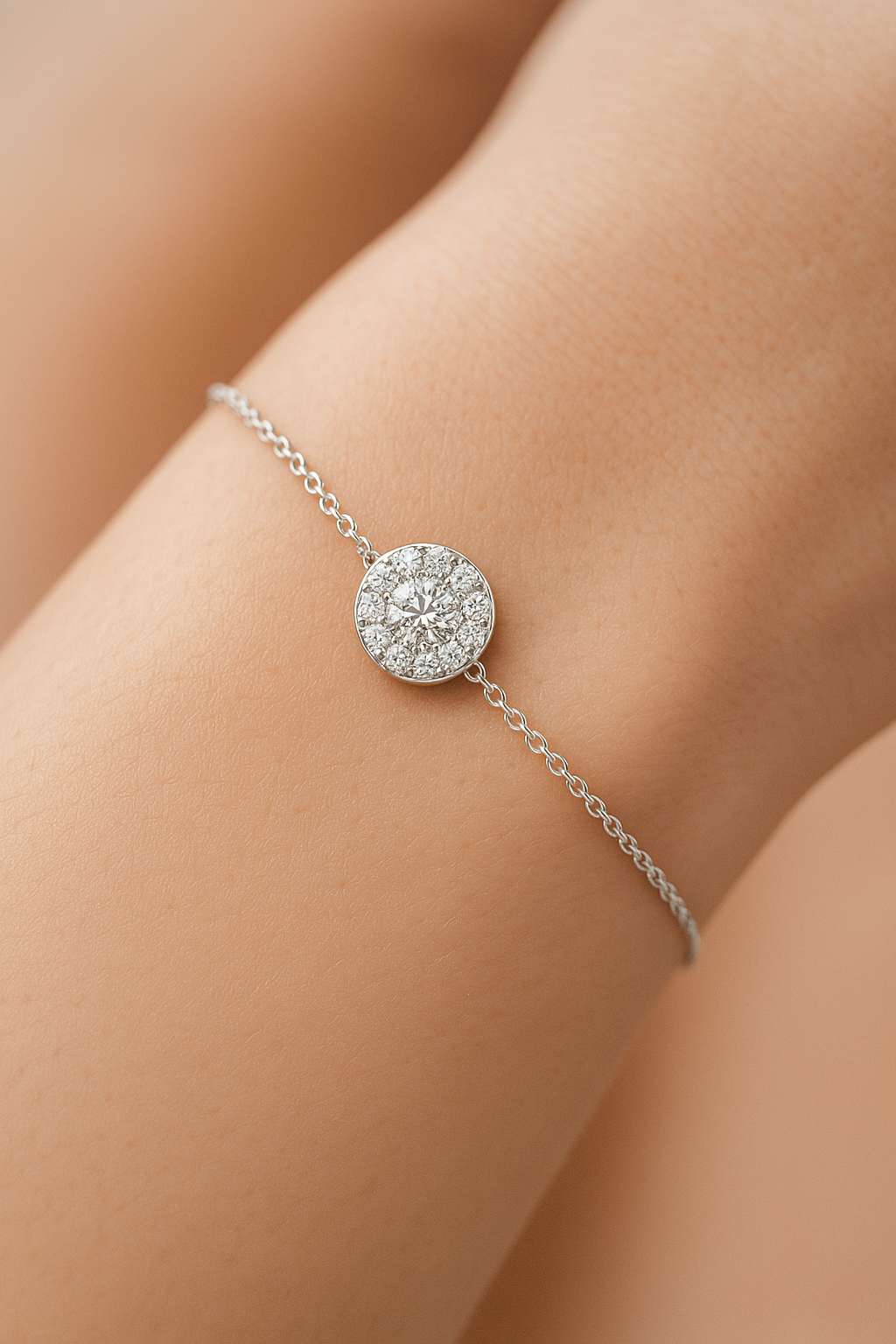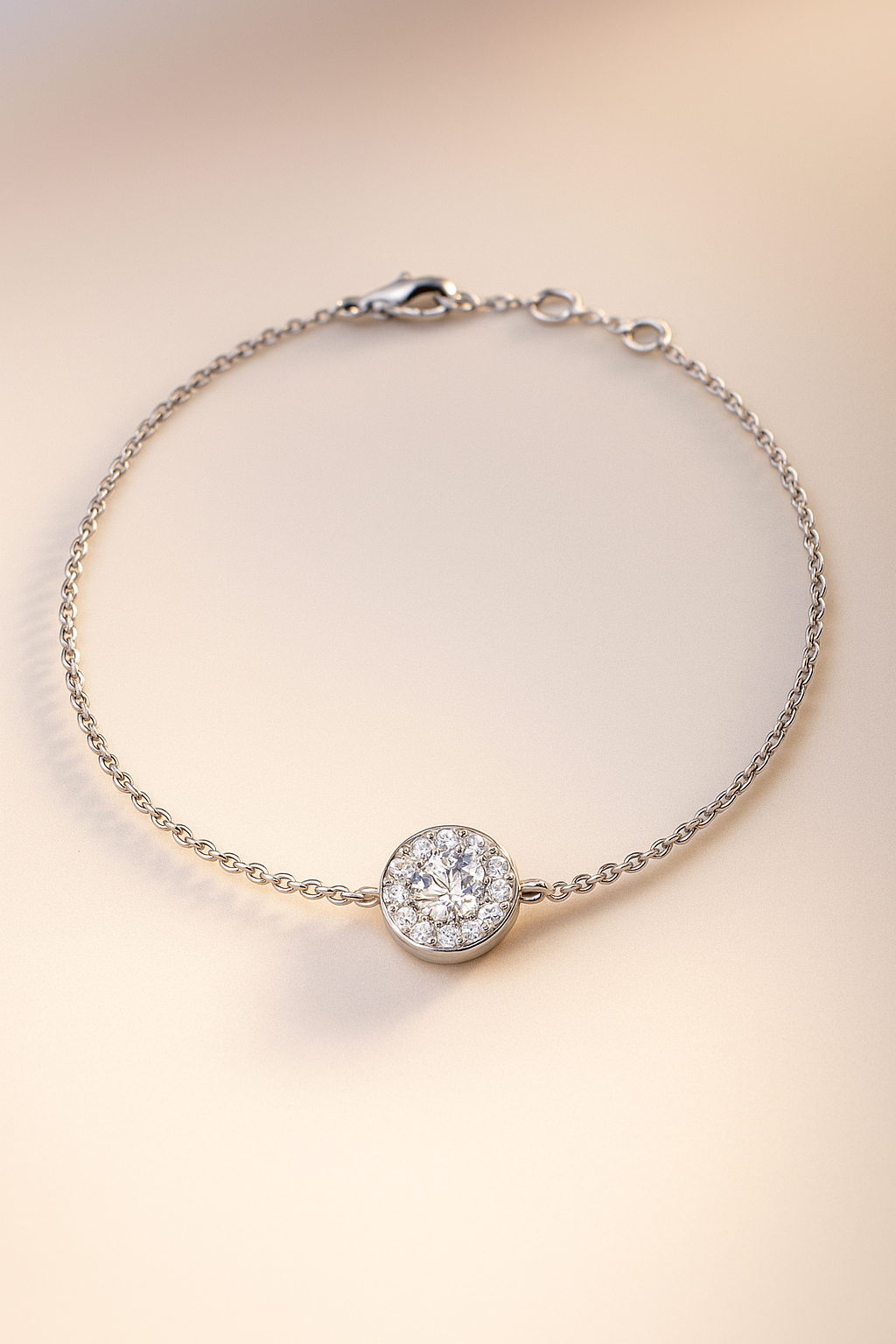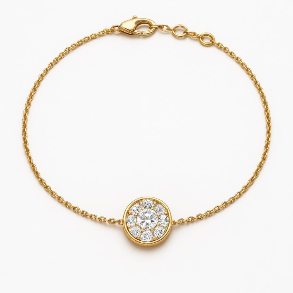 This delicate 7 inch bracelet features a brilliant round lab grown diamond surrounded by a shimmering halo, set on a fine adjustable chain. Ethically crafted for effortless elegance.
